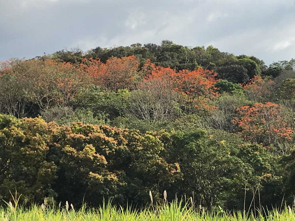 The clouds have closed in as my bus makes its way west from San Jose. Out the window I can see several different kinds of pretty spectacular flowering trees; the most common one seems to be the vivid orange Poró Gigante which has no leaves right now for the most part, just bunches of tangerine-colored blossoms.
