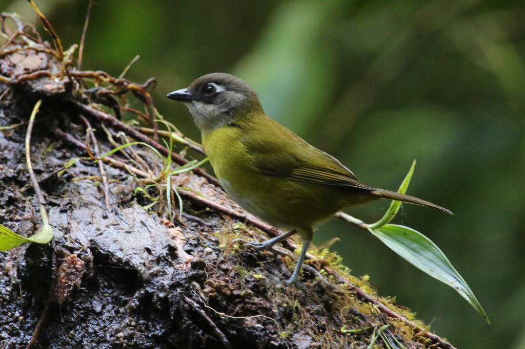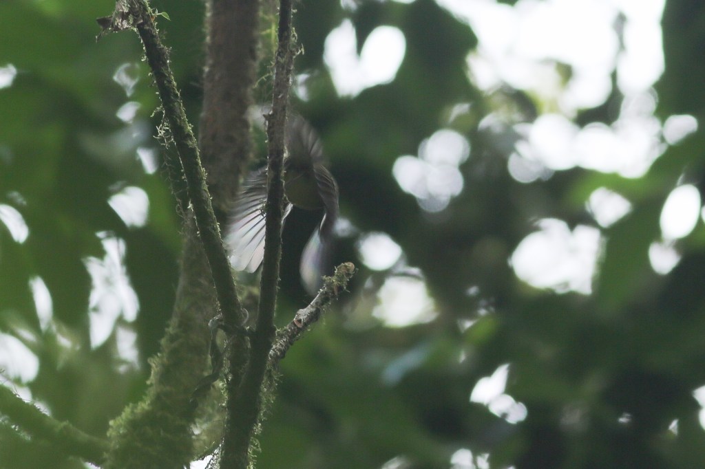 I would like to pause here to recognize something important that is a VERY common misconception. A lot of folks visit rainforest environments picturing documentaries they have seen where there seem to be animals everywhere, monkeys being eaten by eagles, snakes ambushing rodents, and large, colorful birds flying every which way. Unfortunately for people who aren’t documentary film crews, seeing that much wildlife (and capturing it on film) typically takes months or even years. I bring this up because each time anyone walked up on me as I peered through binoculars at a Chlorospingus (above) or flycatcher (below) they excitedly asked what I was looking at. I had to reply “sorry, it’s a very small, green bird” after which they would nod sadly and walk dejectedly down the trail. The point being that unfortunately many people have very skewed expectations for what a great day of observing animals is like. I had a great day for the time I was there; I got to see some beautiful pristine cloud forest, and a few birds.