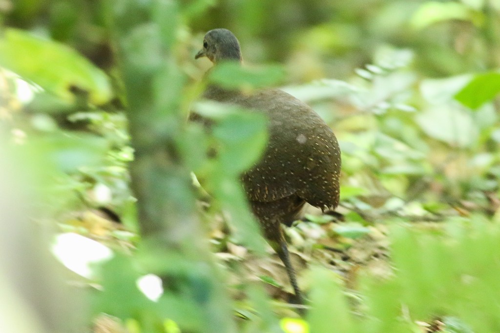 Based on Sergio’s reaction when he realized he didn’t have his camera with him, I told him he should go get it from the car while I watched the Anteater. It didn’t take much convincing for him to go, and he managed to make it there and back in less than two minutes! BUT just after he left, a medium-sized round gamebird dropped out of a tree and ran across the trail: