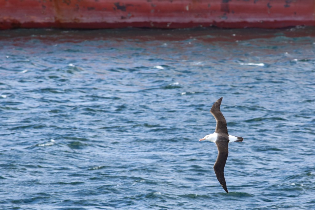 There were *quite a few* tour boats at the dock. We had to walk across one of them to get to ours! The first bird I spotted from the boat was a Black-browed Albatross, slicing through the air in front of a massive cargo ship’s hull.