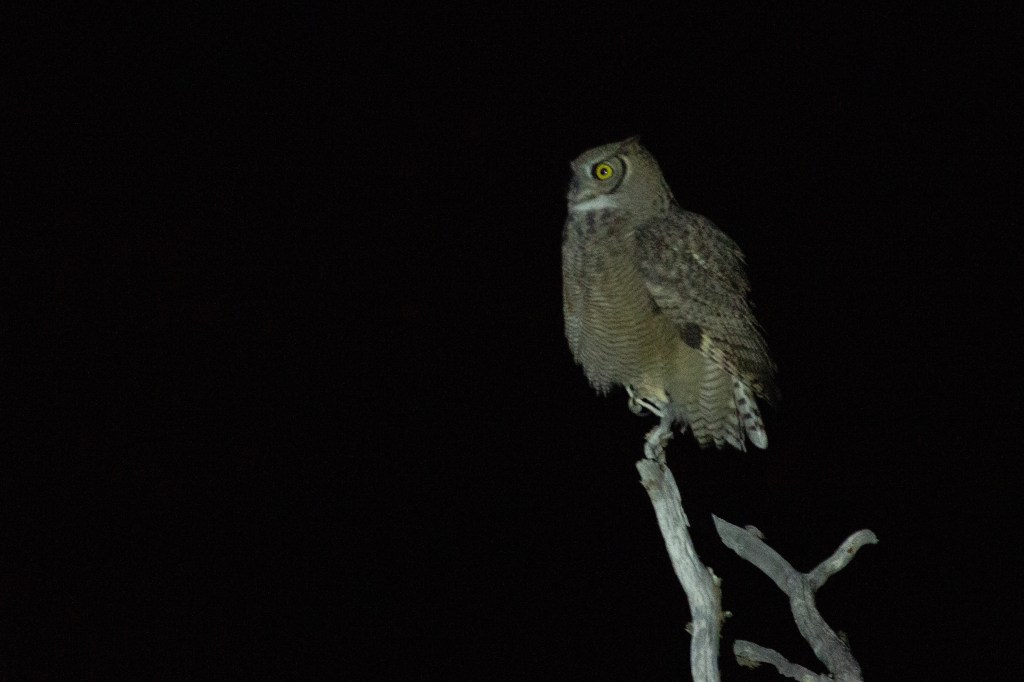 Just before we got back into town, we heard and spotted a Lesser Horned Owl, a bird that was just recently split from Great Horned Owl. I managed to get this picture with a very high ISO and Cris holding the headlamp: