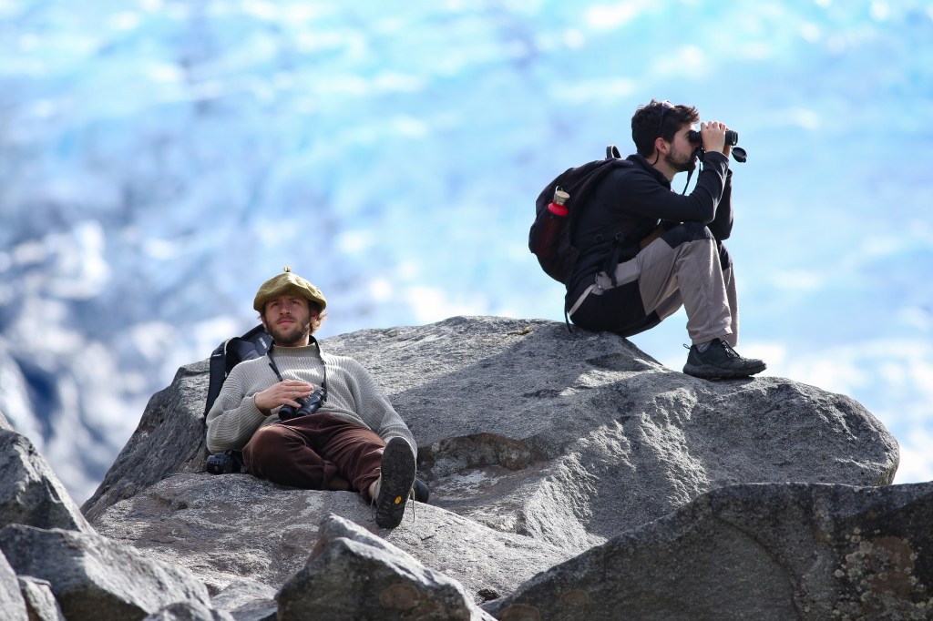 We stopped on the glacial moraine to eat a sandwich, and I snapped a couple candid pictures of them sitting on a rock with the glacier as a background:
