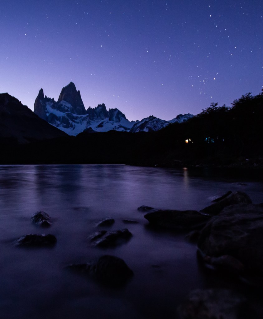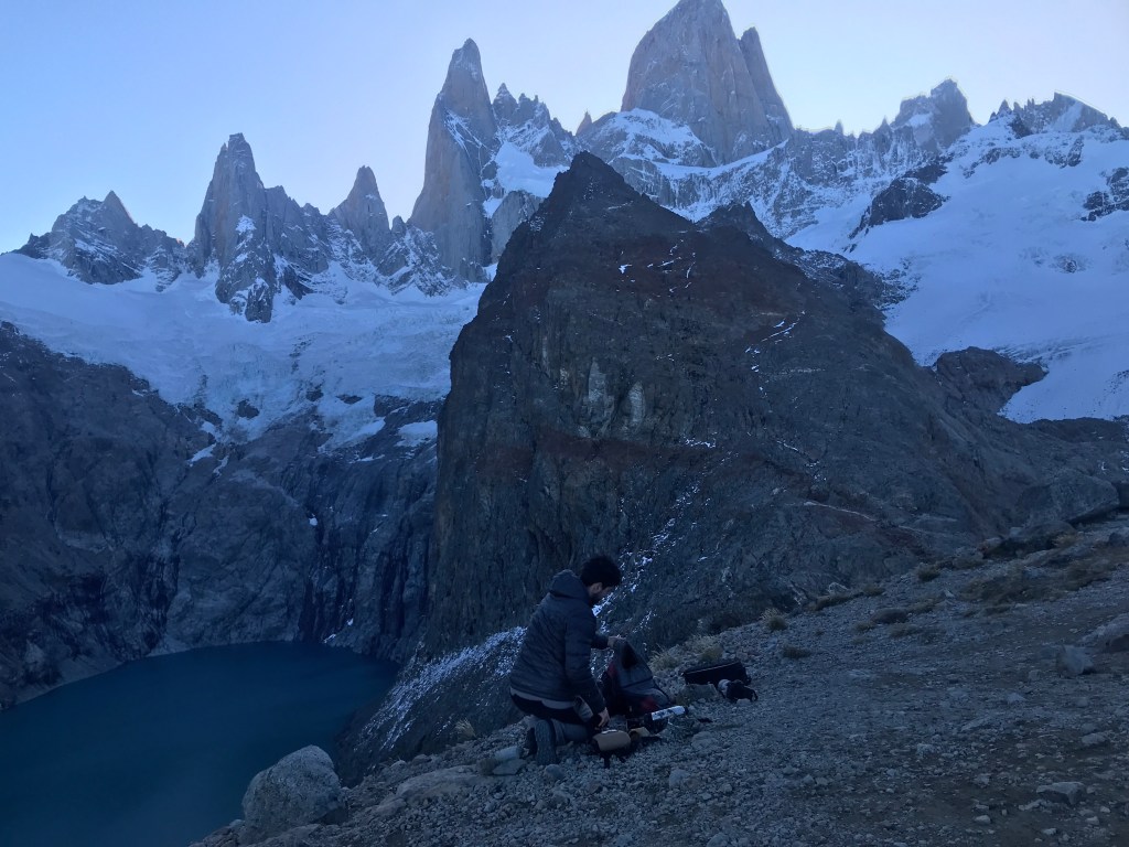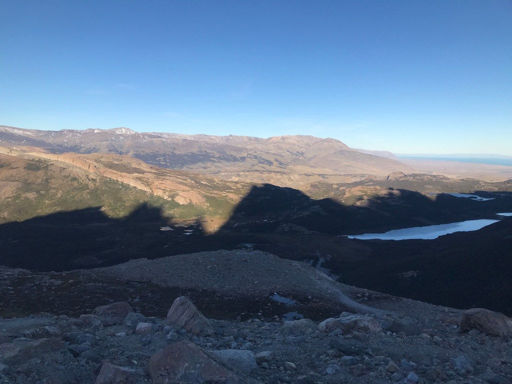 Since we both had headlights with us, we decided that we should just hang around until some of the crowds left. I ate a sandwich and promptly fell asleep, as did Cris. We woke up about an hour later, and we had the place entirely to ourselves. The sensible folks who didn’t want to hike down in the dark were all back in El Chalten by now. Cris thankfully had brought his Maté and thermos, so we sat for a while longer as the sun dropped behind the peak, casting an immense shadow across the valley below.