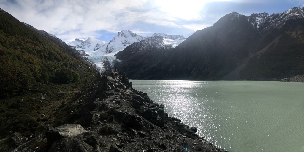 In some of the more closed-in woods we saw and heard some good Austral Forest species, like Thorn-tailed Rayadito, Austral Parakeet and White-throated Treerunner. The trail was about 8 miles each way, and the mile closest to the lake was pretty steep, climbing 1000 feet straight up the rocky slope of the boulder mound (moraine) deposited at the foot of the glacier when it reached much further down the valley. When we got to the top it was pretty evident why it was such a popular hike. We were very lucky to have such a clear day: