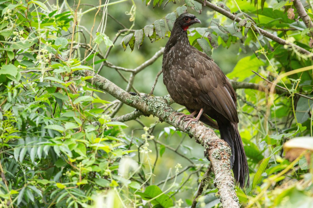 A little farther up a couple of the switchbacks I ran into a little mixed flock, with a couple of Rusty-browed Warbling-Finches, an Azara’s Spinetail and a Dot-fronted Woodpecker. I didn’t get any worthwhile pictures of those fellas but a couple more steps and a dark shape perched near the road caught my eye: a Yungas-endemic Red-faced Guan.