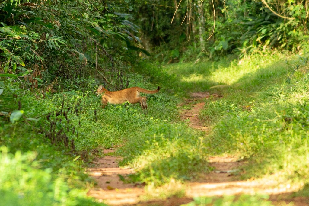 To get to the site, we crossed the entire reserve, more than 40km on a dirt road through the thickly forested interior. At one point, we rounded a corner and a young Puma took off running down the road away from us. I tried to snap a picture but missed just as the puma dashed around the next bend… Sixto said “Okay, we can still see it, get ready!” and absolutely floored it while I stuck my head and shoulders out the window with the camera. The animal came back into view just as it leapt into the underbrush, far down the road. I managed to get this shot: