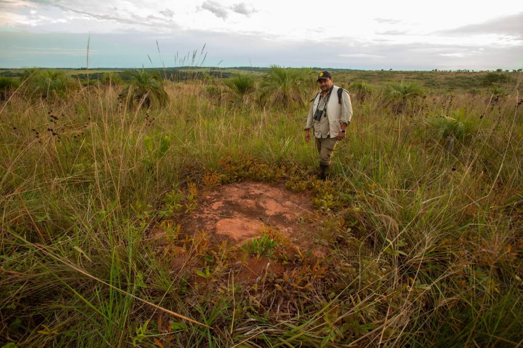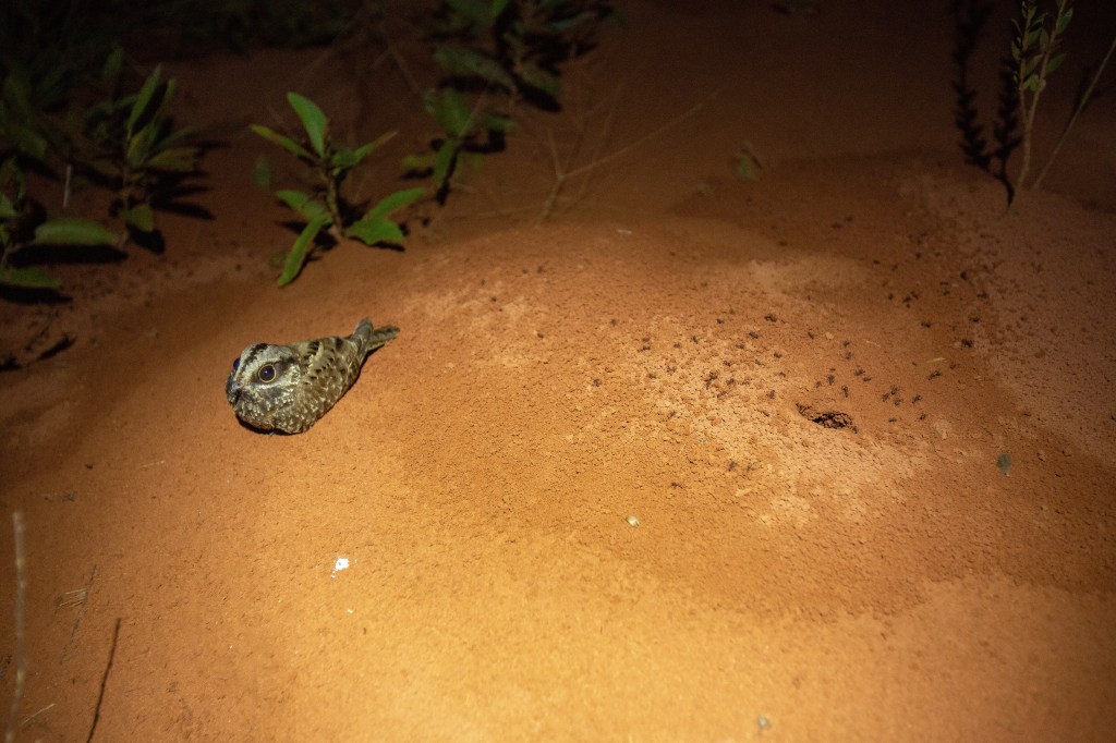 It’s extremely picky in its habitat preferences at Mbaracayú: Sixto has only ever seen them hanging out in savanna which has just the right height of grass and just the right height of palms, with a scattering of bare-earth mounds created by termites. This species is very unusual among nightjars in that it leks: the males gather in a loose group and display to the females, who circle each male until they decide that he’s the one. To facilitate this display (which Sixto has seen many a time) the male uses its namesake white wing-patches to perform a beautiful little dance above a termite mound like this one: