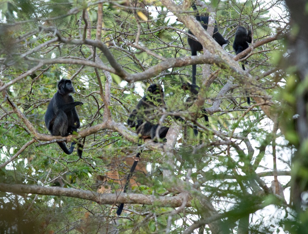 After locating the spectacularly-plumed Junglefowl (yes, it is a cousin of the species that was domesticated and is the modern-day chicken) we walked back to some bird feeders stocked with fruit and waited. Olive-backed Sunbirds chirped and flitted around the understory trees, and a Black-winged Flycatcher-Shrike stayed artfully out of view when I tried to take its picture. I did get this blurry shot of a group of vulnerable Javan Langurs as they swung past the feeding station: