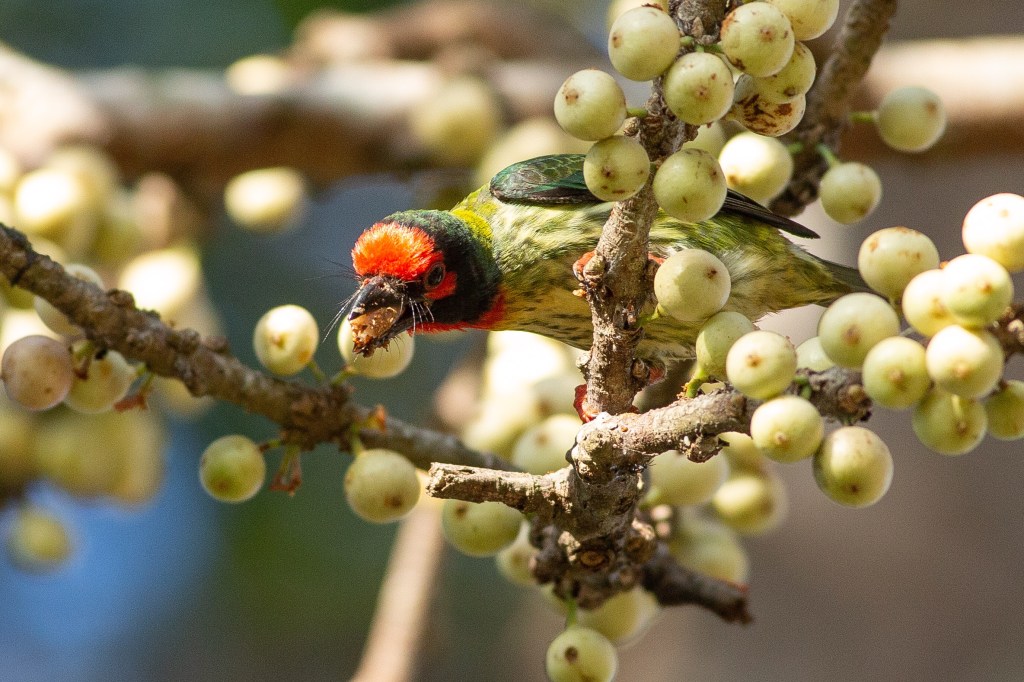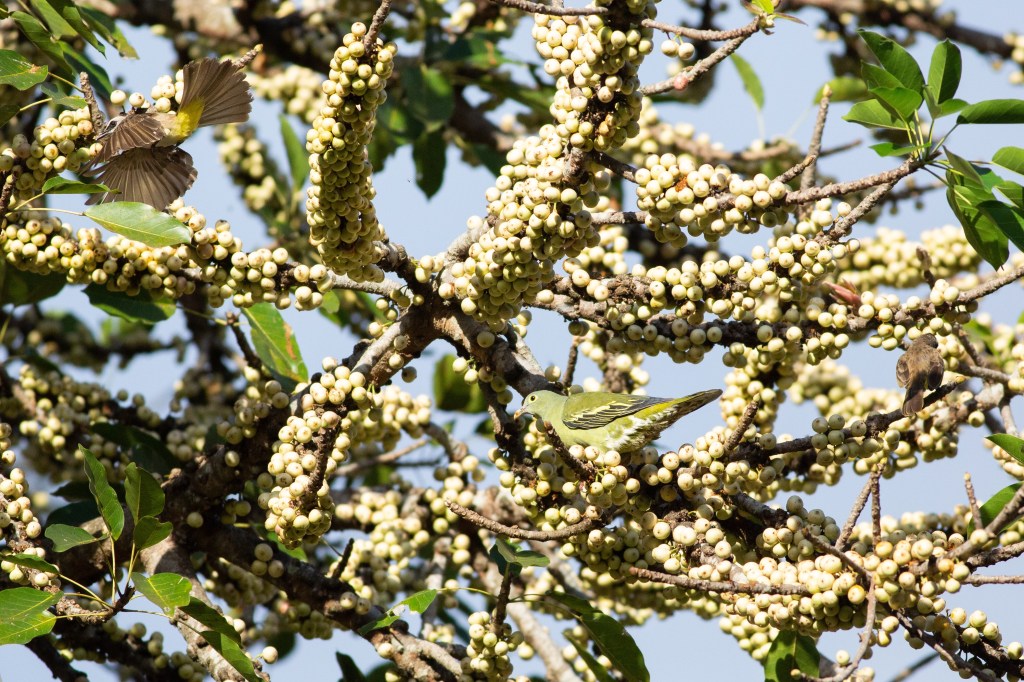 After pondering the bizarre experience of seeing such an incredibly imperiled bird in the wild for a moment, we hopped on the scooter and rode a few hundred meters to the most decadent fruit tree I’ve ever seen in my life. An absolutely MASSIVE fig was completely covered with millions of fruits, and probably nearly 100 birds. Dozens of Yellow-vented and Sooty-headed Bulbuls flew to and from the surrounding trees while several Coppersmith Barbets staked their claim to one branch at a time. Gray-cheeked and Pink-necked Green-Pigeons mingled in the upper branches, and a few Bali Mynas even joined the party. I simply could not believe how much fruit was on this tree.